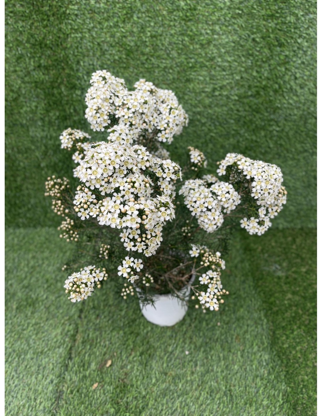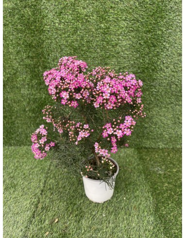 La Pianta Wax Flower chiamata anche Fiore di Cera, sviluppa un piccolo arbusto, che difficilmente supera i 2-3 metri di altezza se coltivato in piena terra.Le piante di wax flower sono arrotondate, con sottili fusti ben ramificati che danno origine ad un arbusto denso; il fogliame è aghiforme, leggermente carnoso e coriaceo, contiene olii essenziali che lo rendono molto profumato se schiacciato, con un sentore di spezie e limone. Tra la fine dell'inverno e l'inizio della primavera produce innumerevoli piccoli fiori, in particolare all'apice dei rami; i fiori di chamelaucium sono piccoli, di colore bianco o rosa, con centro a forma di piattino, di colore porpora, delicatamente profumati. I fiori di wax flower sono molto resistenti anche sui rametti recisi, e infatti viene molto utilizzata come fiore reciso, ed è per questo coltivata in alcune zone del mediterraneo