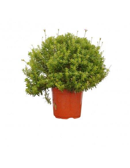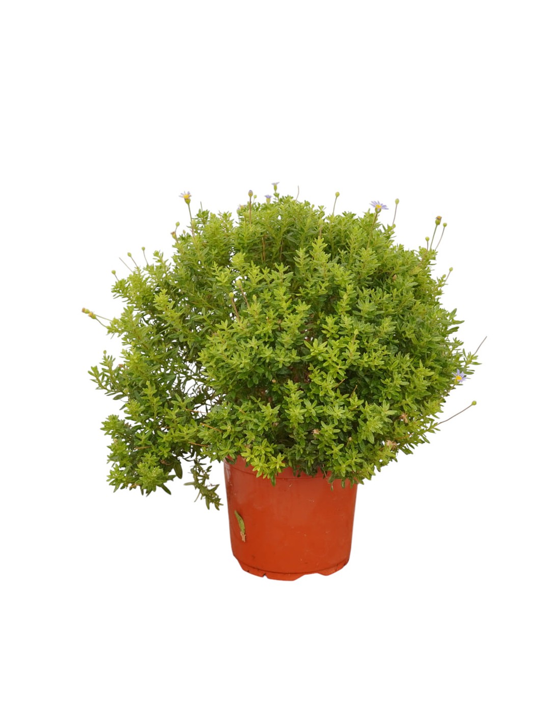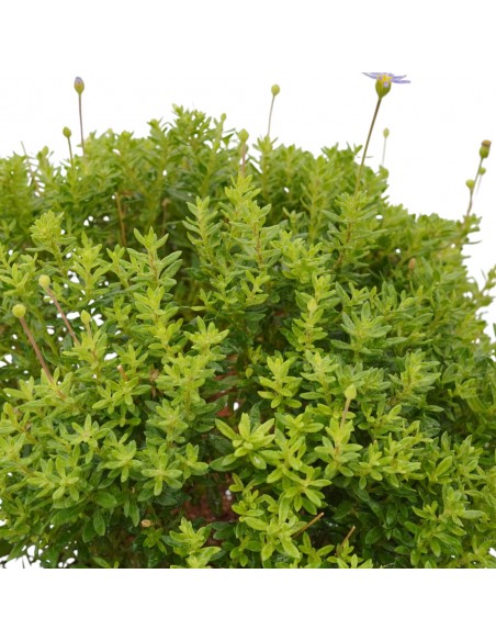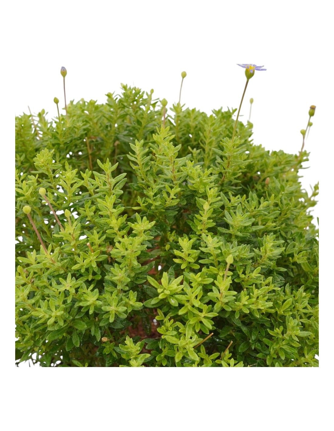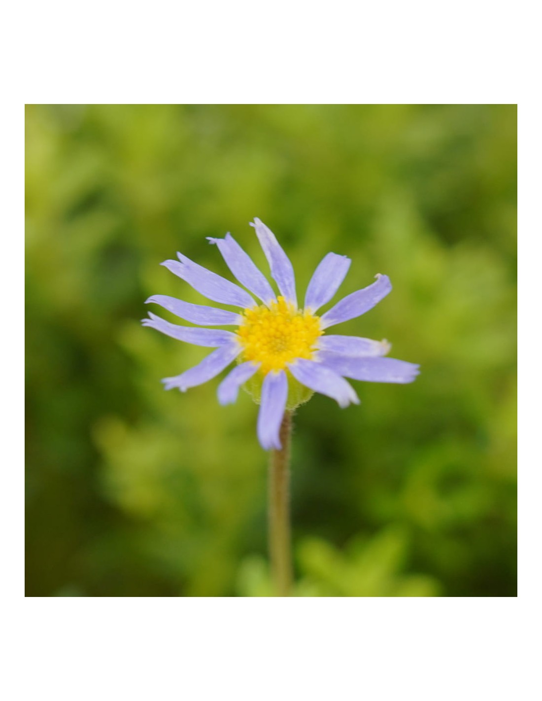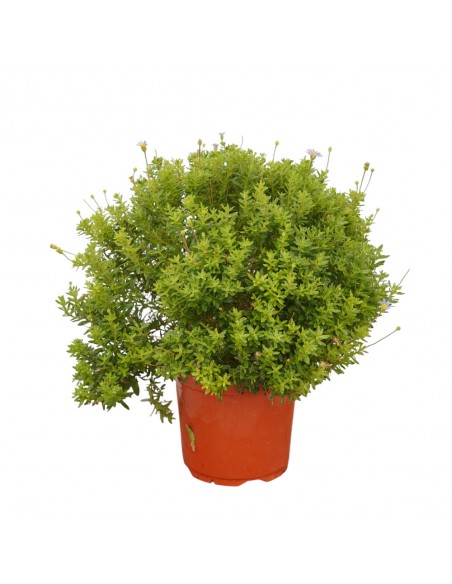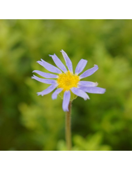 Produce un bel cuscino densamente ramificato, costituito da piccole foglie ovali, completamente ricoperte da una sottile peluria rada, che le rende abbastanza ruvide, di un bel colore verde scuro; per tutta la bella stagione produce sottili steli, che si alzano al di sopra delle foglie, e portano piccoli capolini con centro dorato e petali esterni di colore blu cielo.