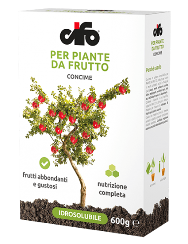 Concime in polvere idrosolubile per piante da frutto, indicato per nutrire in modo completo tutte le frutticole quali pesco, melo, albicocco, susino, olivo, melograno, nocciolo, noce, vite ecc. coltivate in vaso o in piena terra.