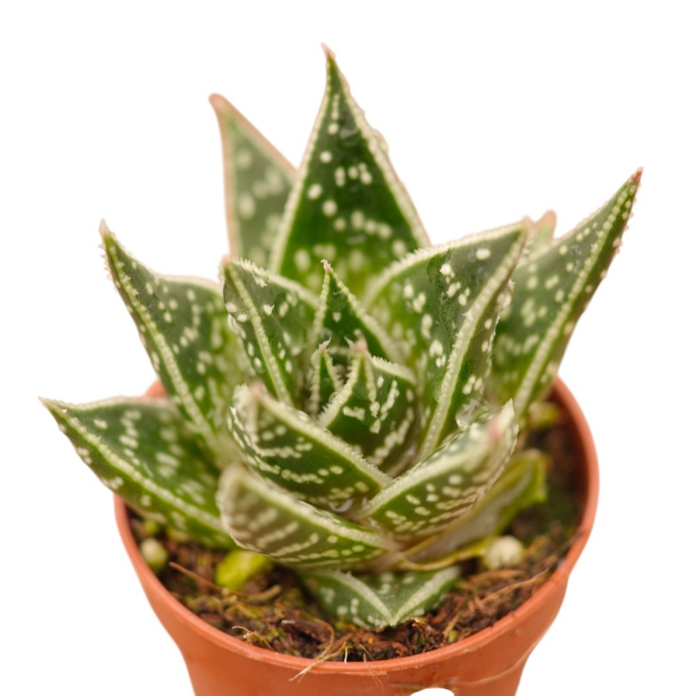 L'unione fa la forza! La Gasteraloe 'Flow' è un incrocio spettacolare che eredita la forma a rosetta dell'Aloe e la resistenza estrema della Gasteria. Si presenta con foglie spesse, rigide e triangolari, di un colore verde bosco scurissimo, quasi nero, punteggiate da minuscoli tubercoli bianchi in rilievo. È la pianta "da scrivania" definitiva: elegante, compatta e capace di sopravvivere anche se ti dimentichi di lei per settimane.